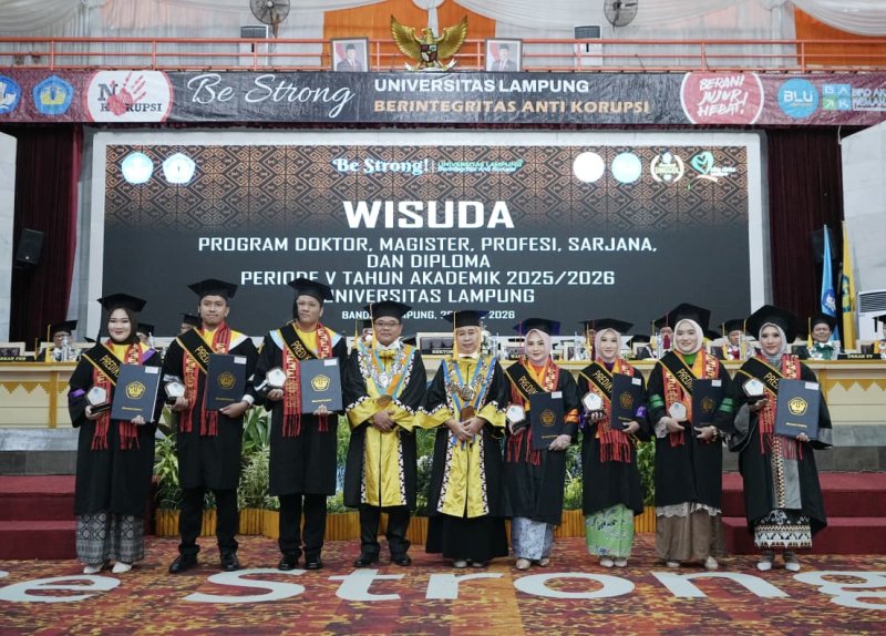 PERISAILAMPUNG.COM — UNIVERSITAS Lampung (Unila) menggelar wisuda program doktor, magister, profesi, sarjana, dan diploma periode V Tahun Akademik 2025/2026 pada Sabtu, 25 April 2026, di Gedung Serbaguna Unila.